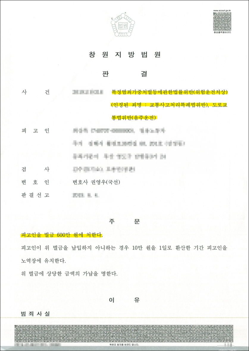 혈중알코올농도 0.138%는 면허취소 기준을 훨씬 초과하는 수치이며, 상해 사고까지 발생한 경우 대부분 집행유예 이상의 처벌이 선고되는 것이 일반적입니다. 이런 점에서 볼 때, 이번 사건에서 실형 없이 벌금형으로 마무리된 것은 사건의 성격과 방어 전략이 신중하게 작용한 결과라 할 수 있습니다.